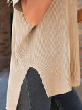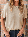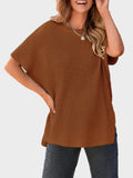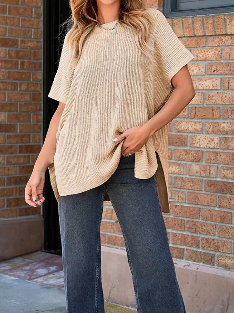 Step into effortless style with this oversized knit top, crafted from soft, breathable knitwear for a relaxed, comfortable fit. The drop shoulder design and short sleeves create a modern, laid-back silhouette, while the side slit adds subtle movement and versatility. Perfect for pairing with jeans or leggings, this top is your go-to piece for chic casual fall looks.