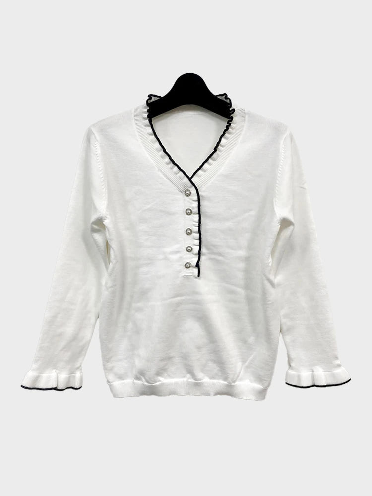 Features: Long sleeve, round neckline, delicate lace detailing, lightweight knitted design, pullover style.