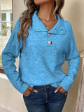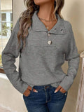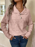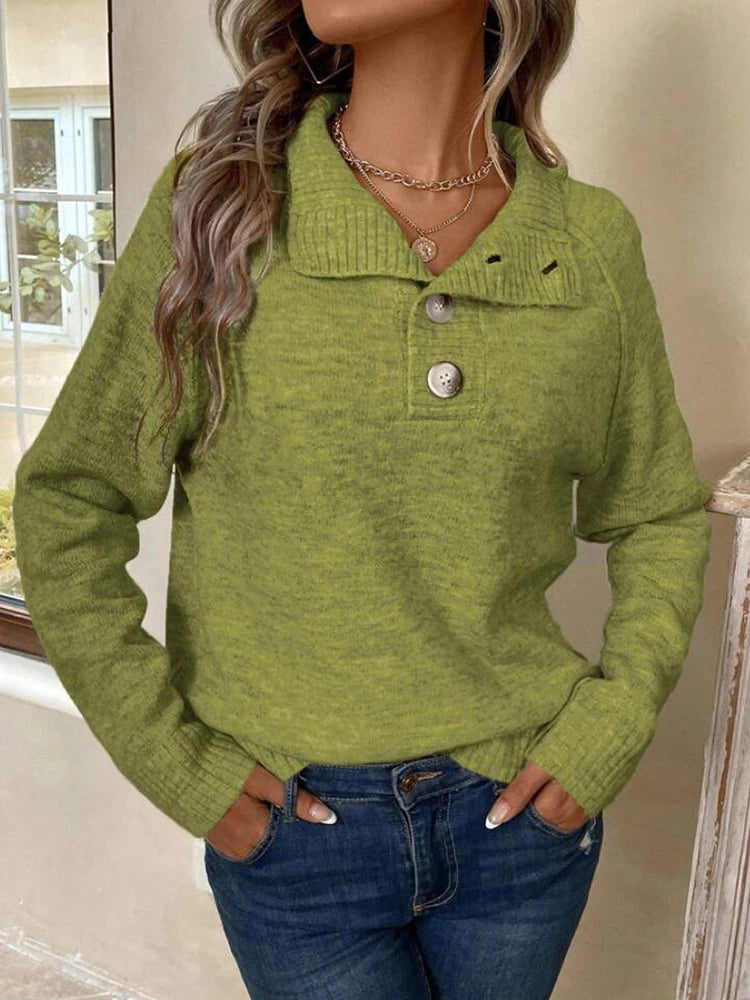 Features: Long sleeve, stand collar with button-front detail, soft knitted texture, pullover design.