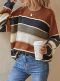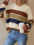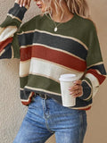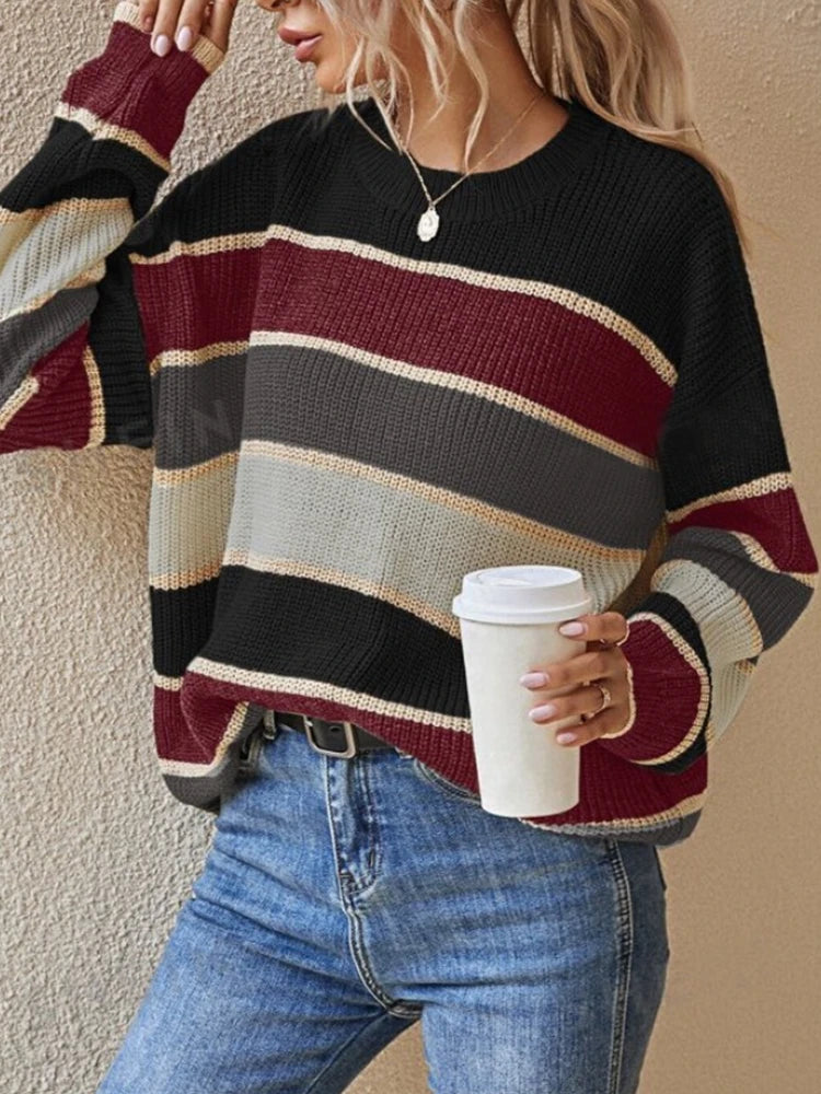 Features: Long sleeve, crewneck, classic striped pattern, soft knitted texture, pullover design.