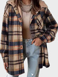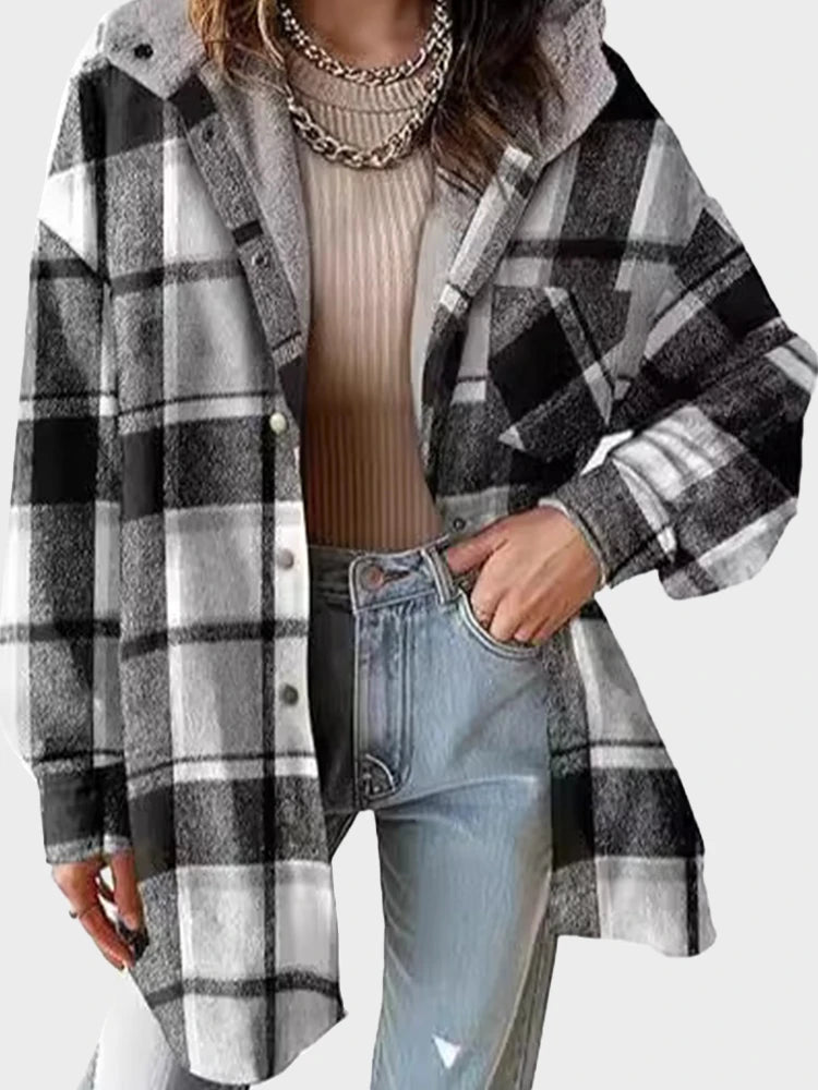 Fall and Winter Women'S Flannel Plaid Shacket Long Sleeve Winter Button Down Color Block Hooded Coat Tops