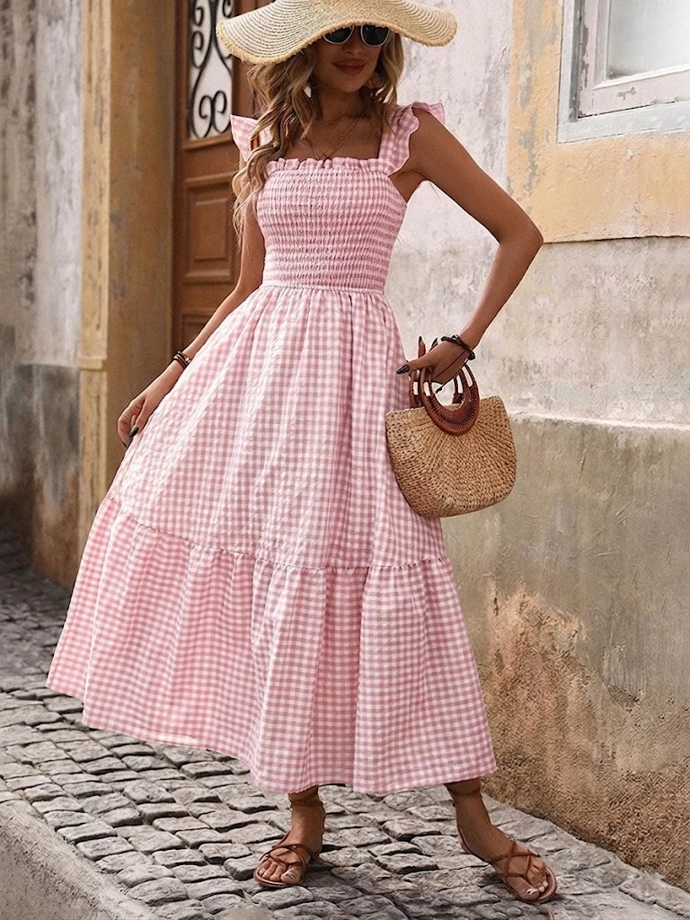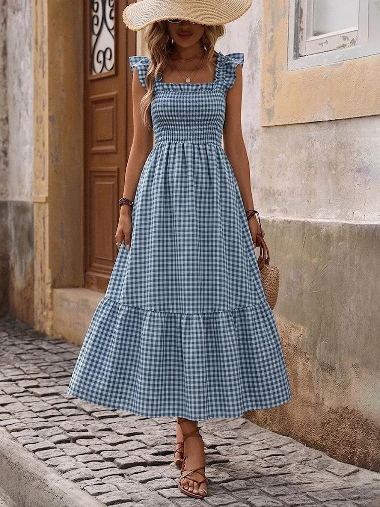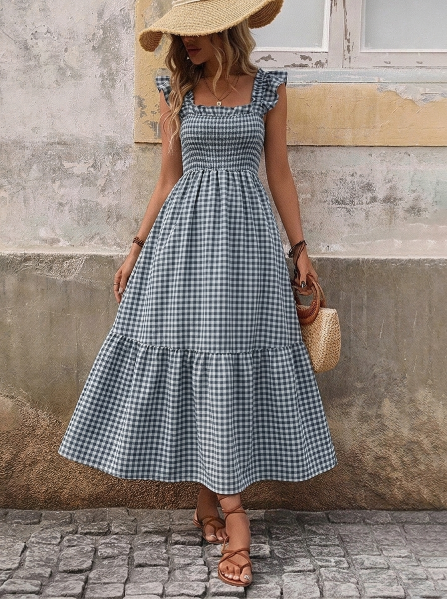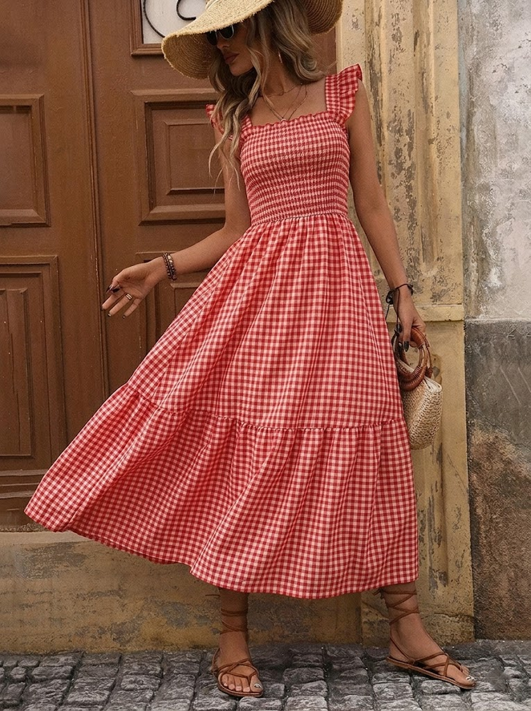 Upgrade your warm-weather wardrobe with this Retro Smocked Plaid Maxi Dress — designed for effortless comfort and a naturally flattering fit. Featuring a stretchy smocked bodice, a flowy maxi silhouette, and a timeless plaid pattern, this dress offers an easy, feminine look without feeling restrictive. Finished with practical side pockets and soft shoulder details, it’s perfect for vacations, brunch dates, casual outings, and everyday wear.