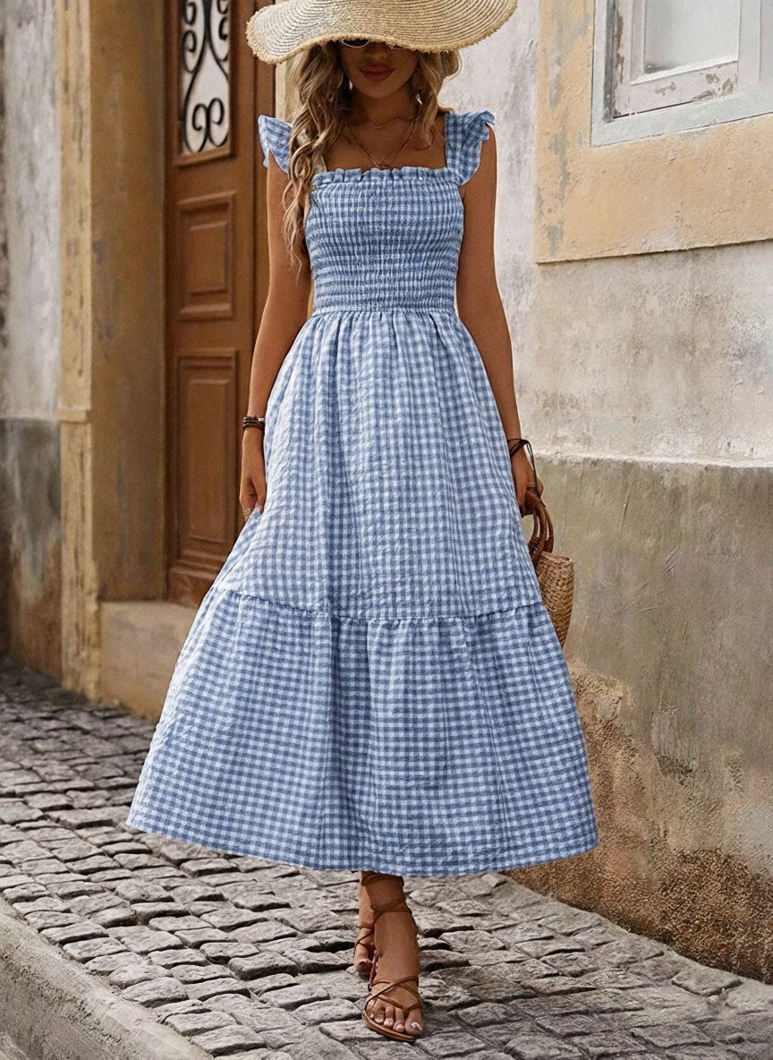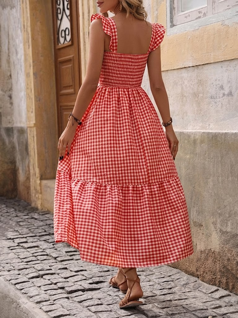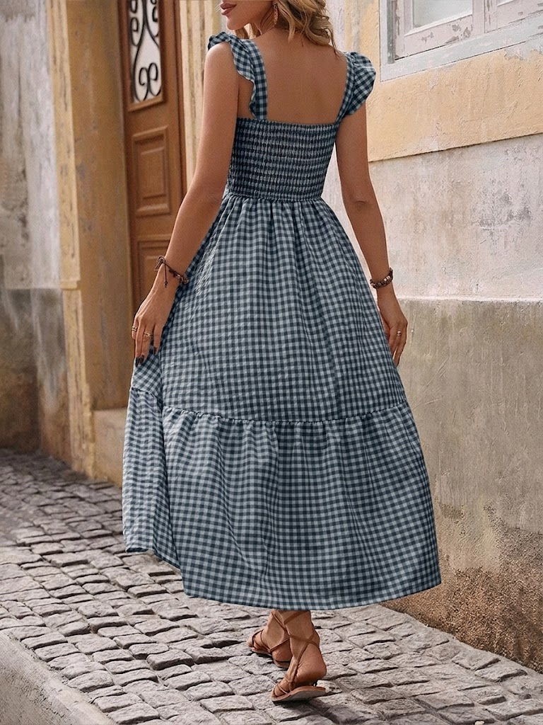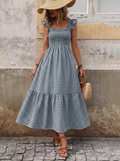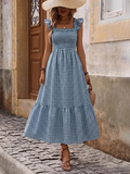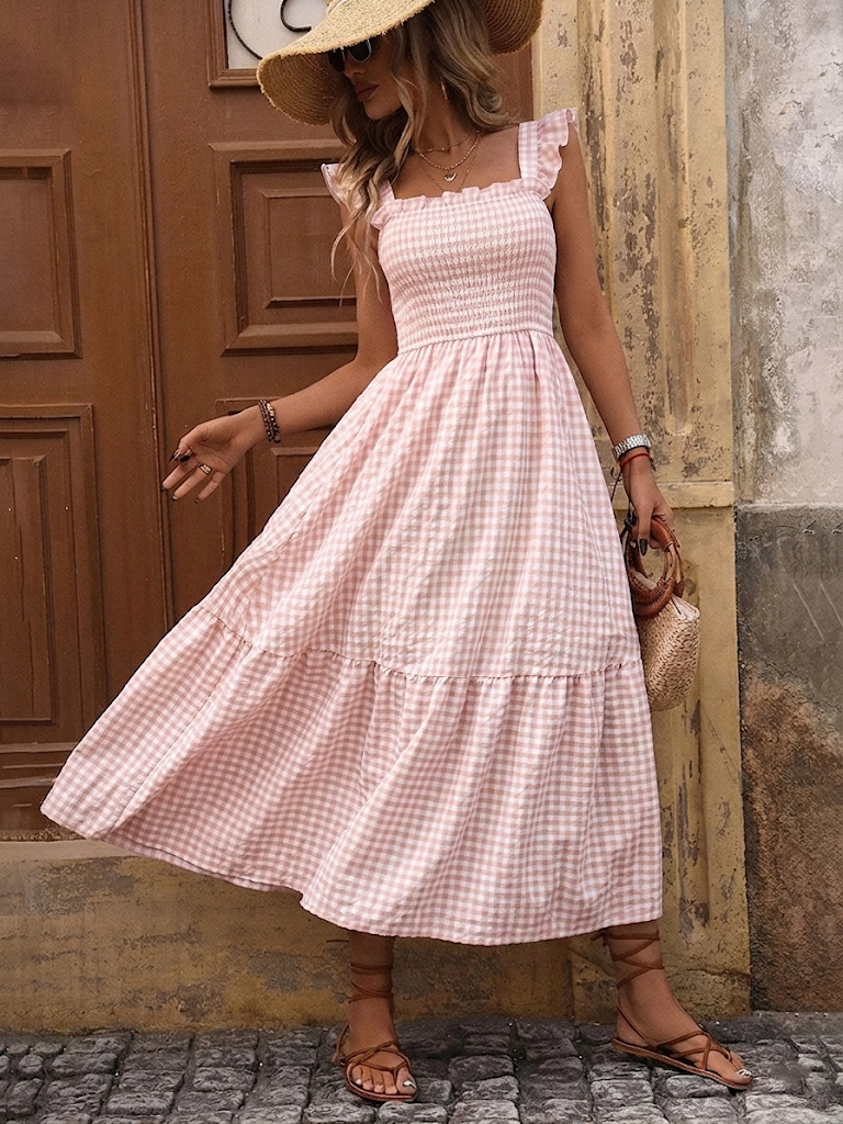 Upgrade your warm-weather wardrobe with this Retro Smocked Plaid Maxi Dress — designed for effortless comfort and a naturally flattering fit. Featuring a stretchy smocked bodice, a flowy maxi silhouette, and a timeless plaid pattern, this dress offers an easy, feminine look without feeling restrictive. Finished with practical side pockets and soft shoulder details, it’s perfect for vacations, brunch dates, casual outings, and everyday wear.
