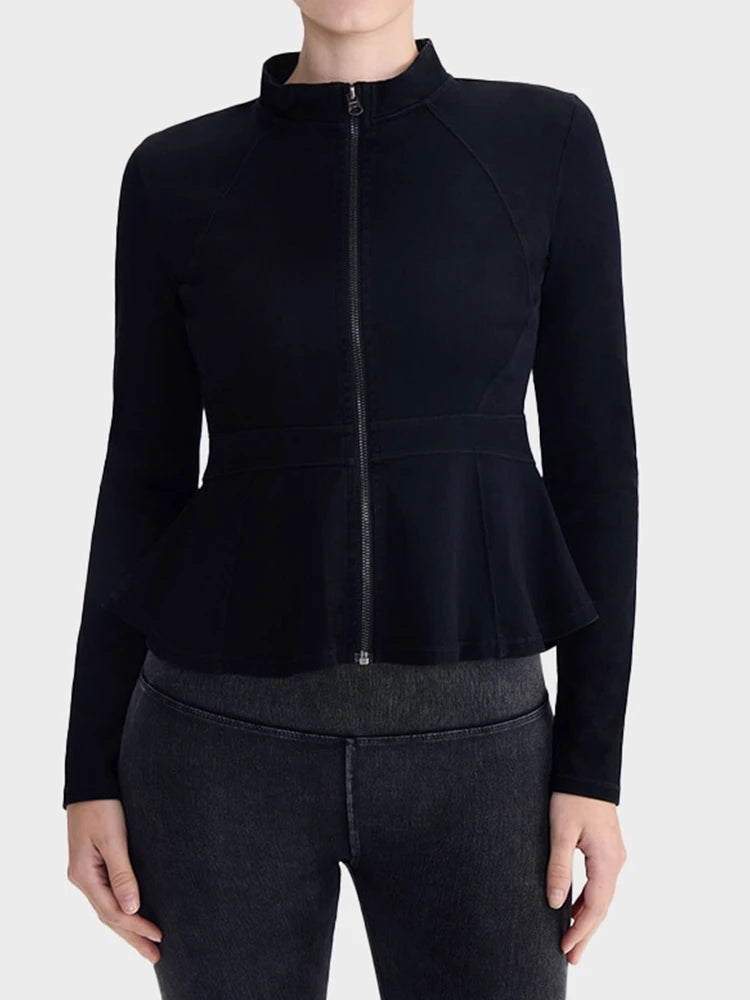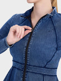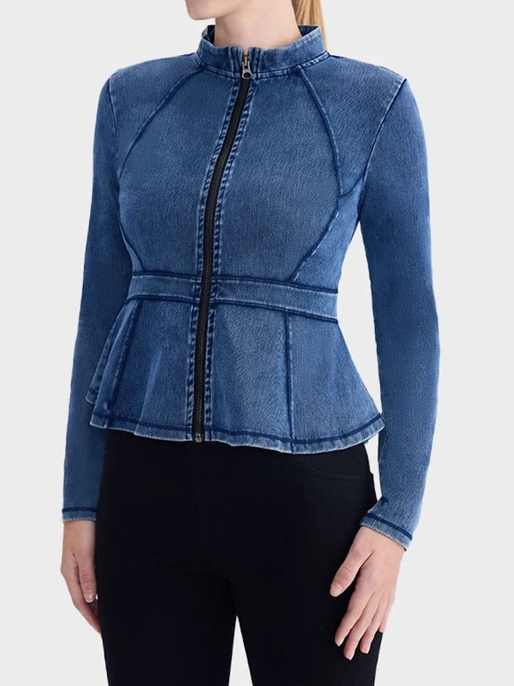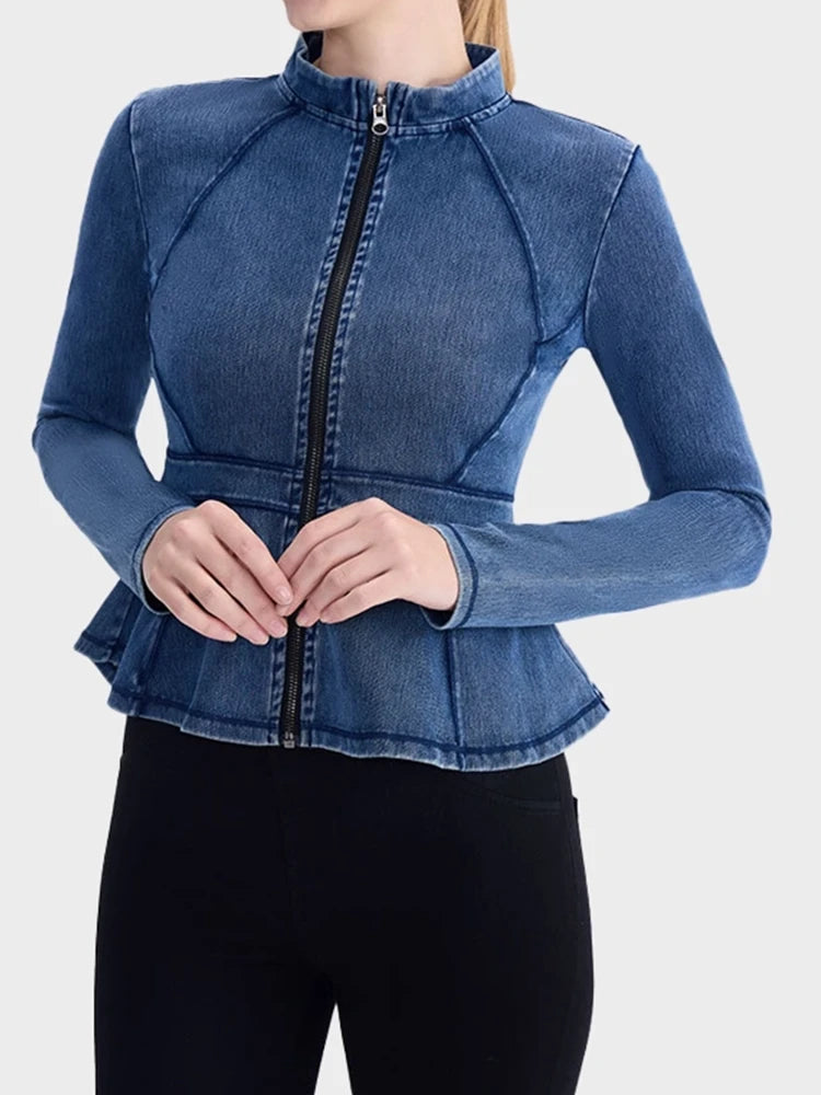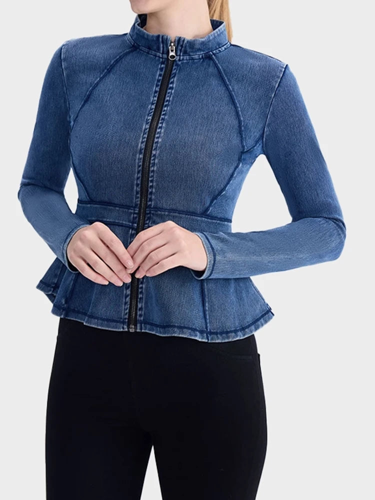 Slim Fit High-Neck Denim Zip-Up Yoga Jacket with Double Pockets