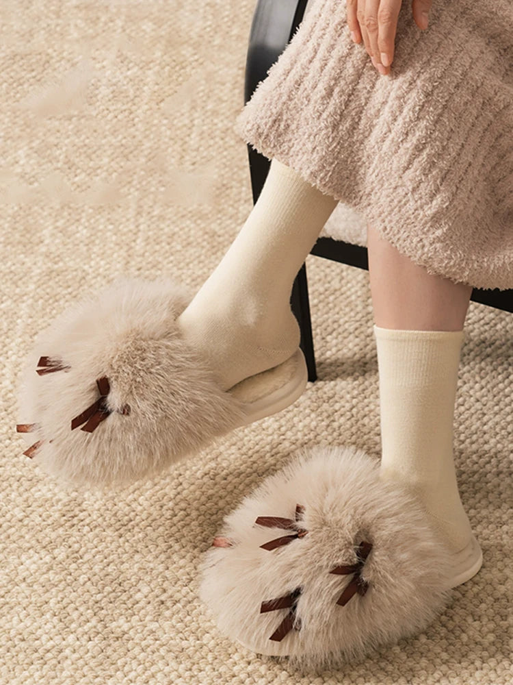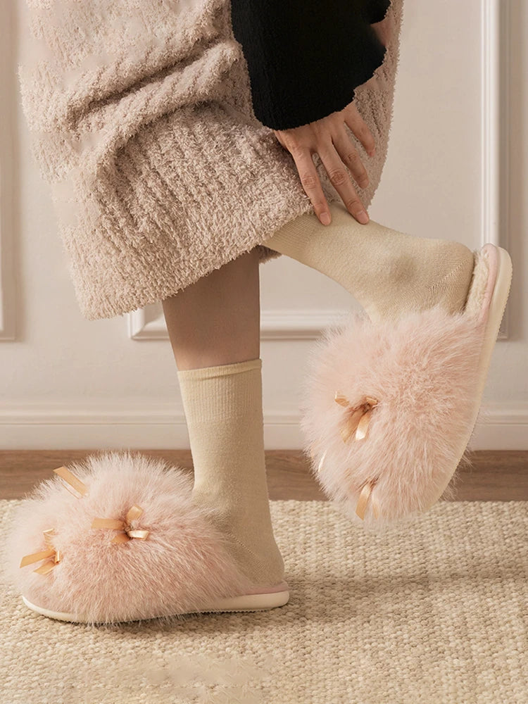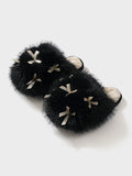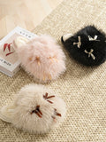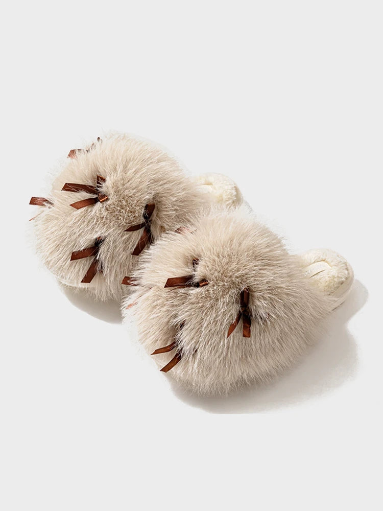 Women’s Fluffy Bow Plush Slippers – Warm Fuzzy Indoor Slides with Thick Soft Soles