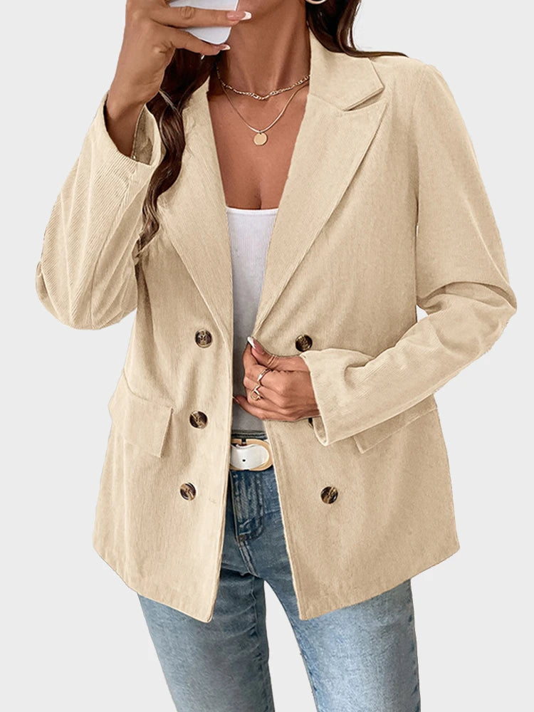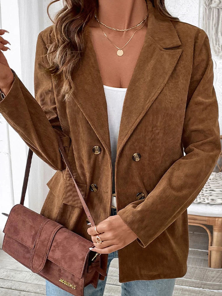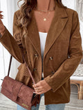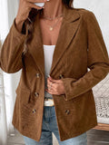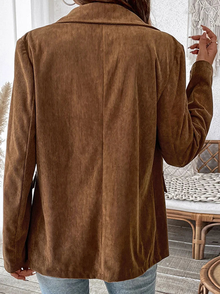 Fall corduroy blazer for women featuring front single breasted buckle, notch collar, long sleeves, open front button down placket, regular length.