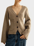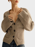 - Features - Open front, sexy deep v-neck, crop loose fit, button up, ribbed knit trims, relaxed extended sleeves, plain solid color, womens cardigan sweaters with patch pockets.