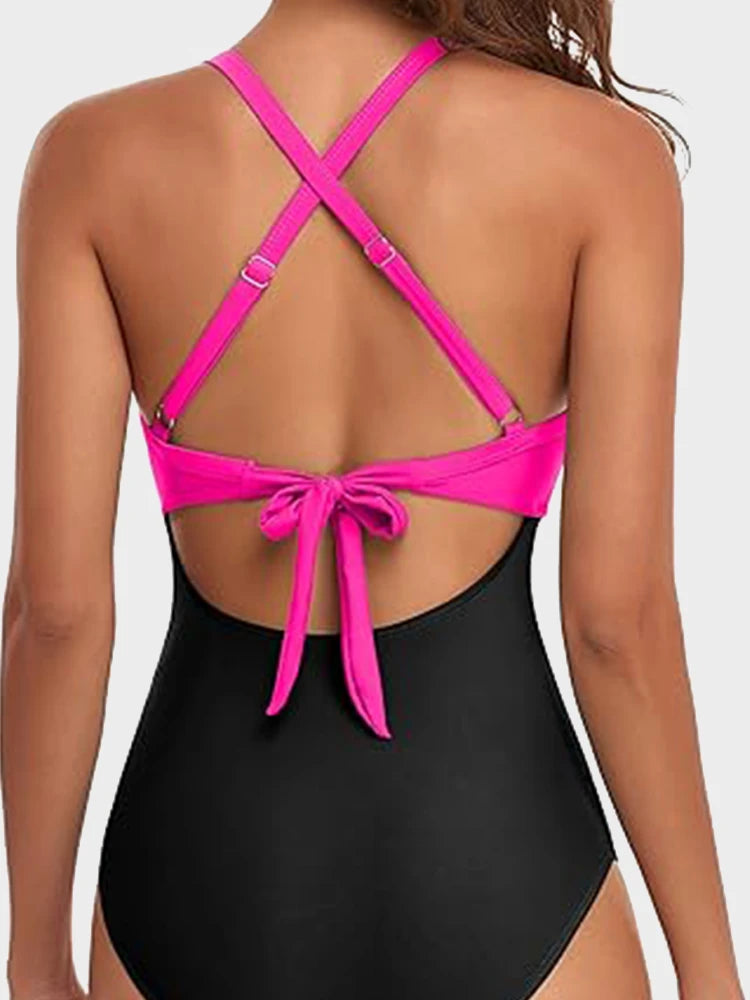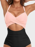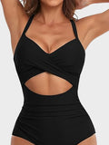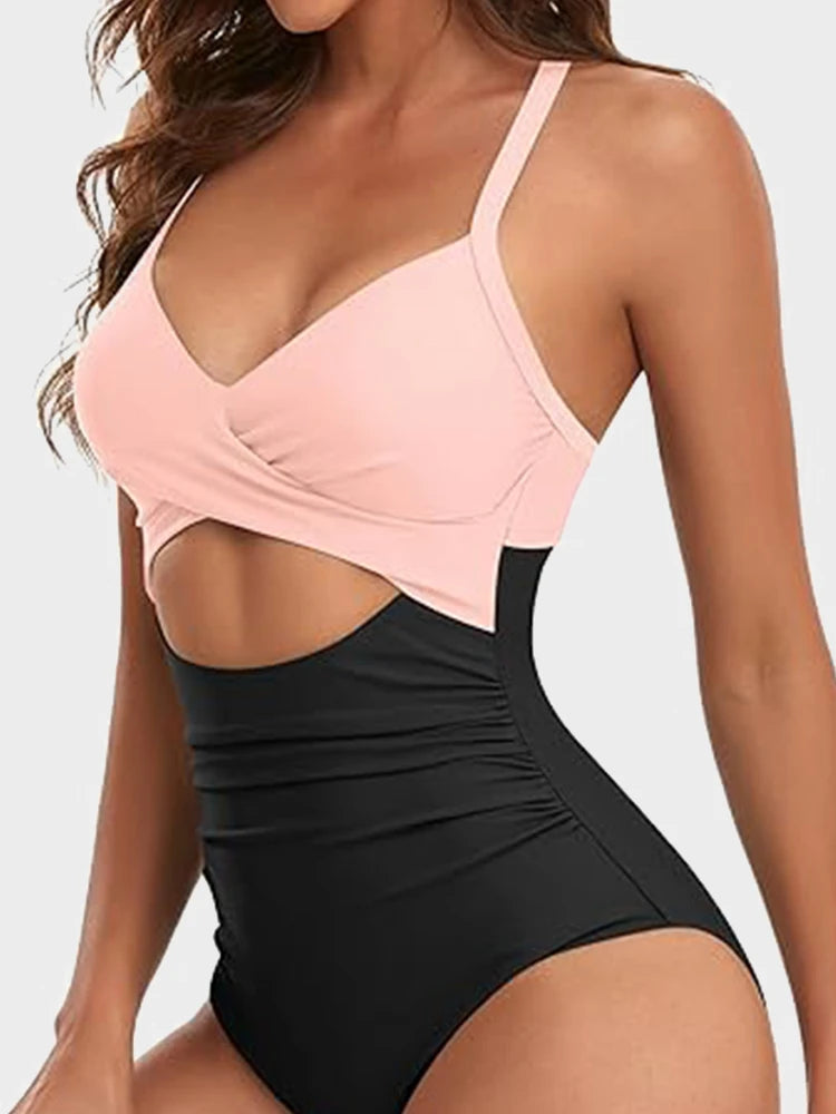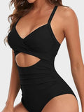 • Tummy-Control Mesh Lining, Ruched Design, Front Cutout, Elastic Band Underbust, Built-In Removable Cups, Adjustable Straps, Generous Bottom Coverage