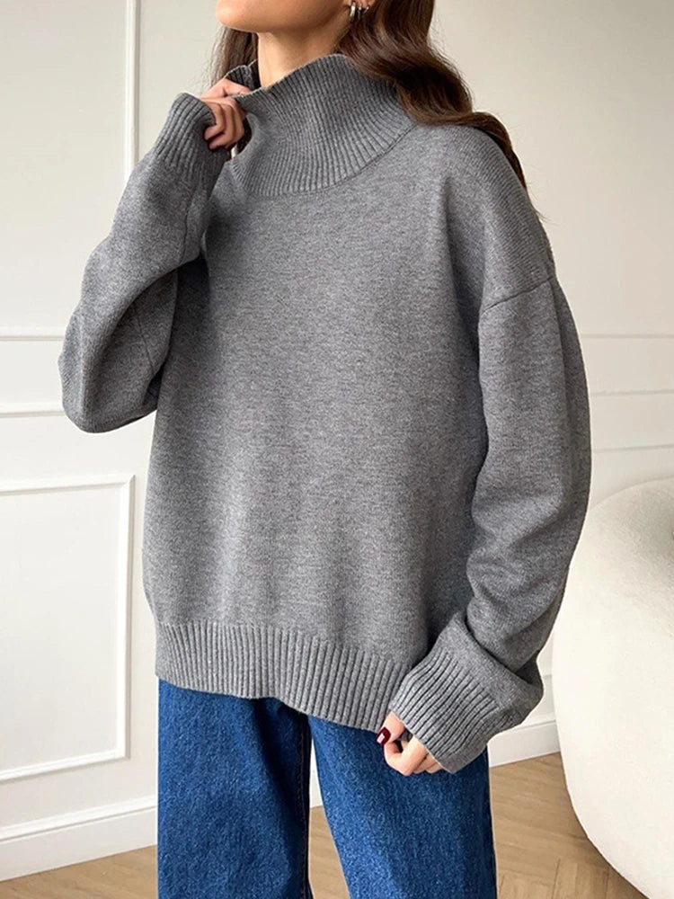 - Fit Type - Oversized. The women's turtleneck sweater offers an oversized fit. Its classic high neck and long sleeves provide elegant styling, making it wearable as both a base layer and outerwear.