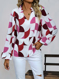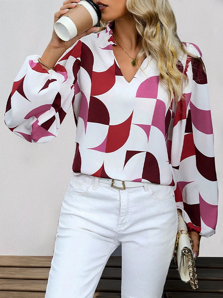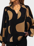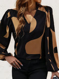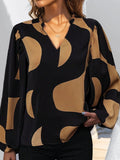 Womens V Neck Brown Abstract Print Puff Sleeve Loose Blouse